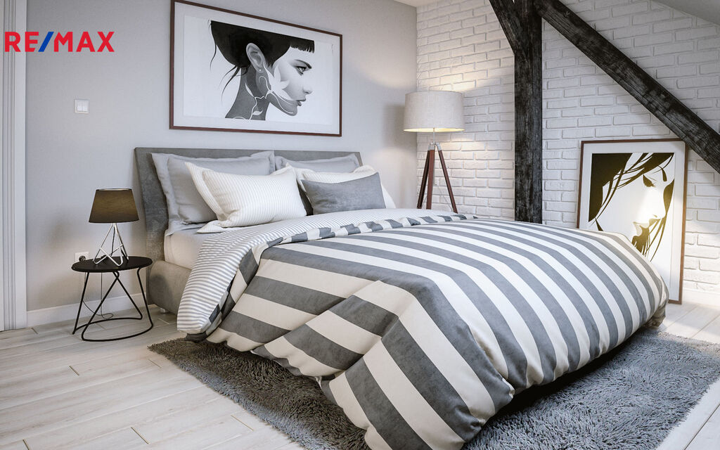 Po točitém schodišti se dostanete do horního patra bytu, kde je chodba, vstup do koupelny s vanou a WC, hlavní ložnice, dva samostatné pokoje a technická místnost.