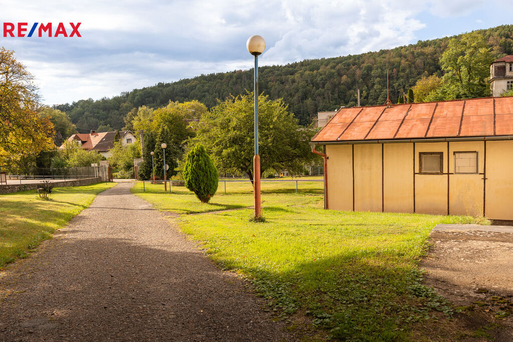 V mírně svažité, udržované zahradě, která má přes 5900 m2 se nachází alej vzrostlých bříz a ovocné dřeviny, dále zpevněné volejablové hřiště, zahradní krb a altán. Celý areál je oplocený a vede jím jednosměrná zpevněná komunikace.