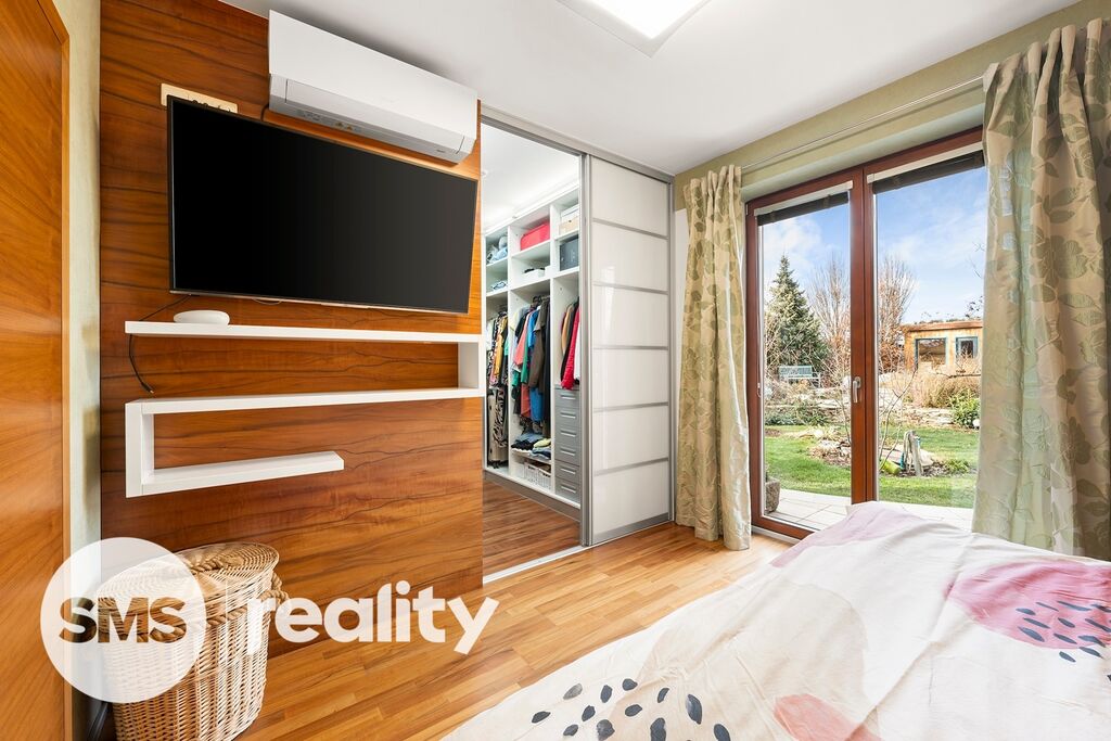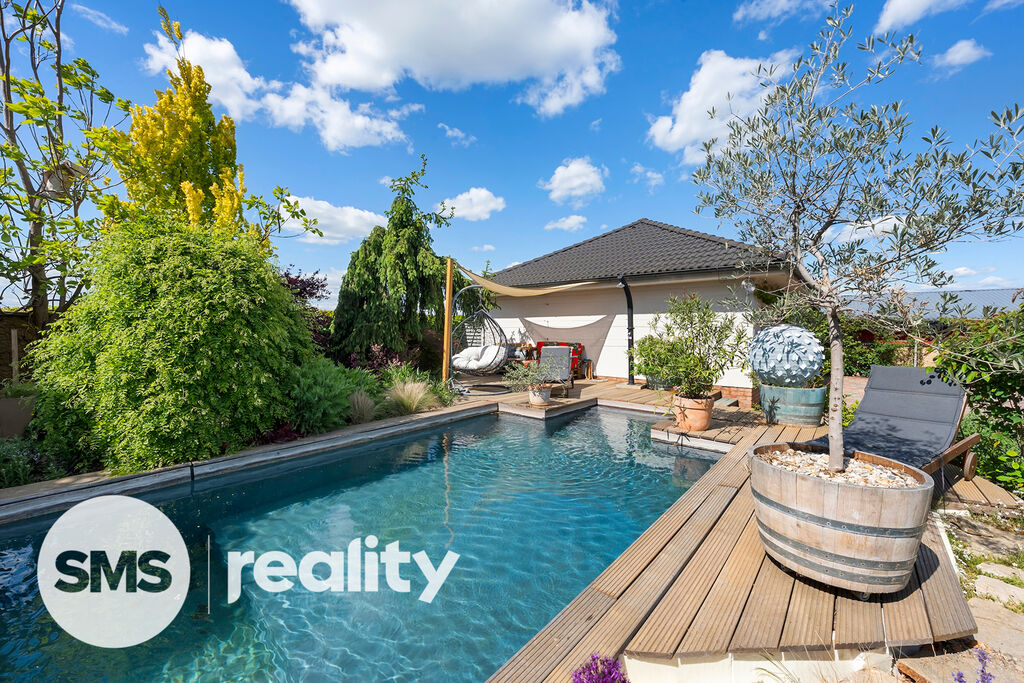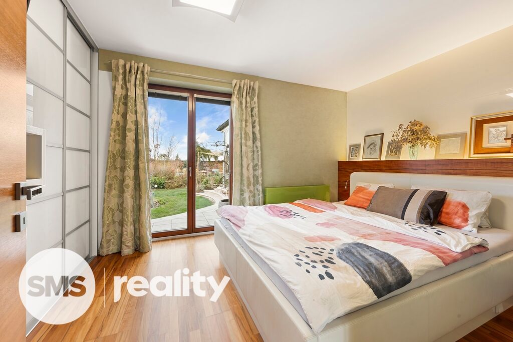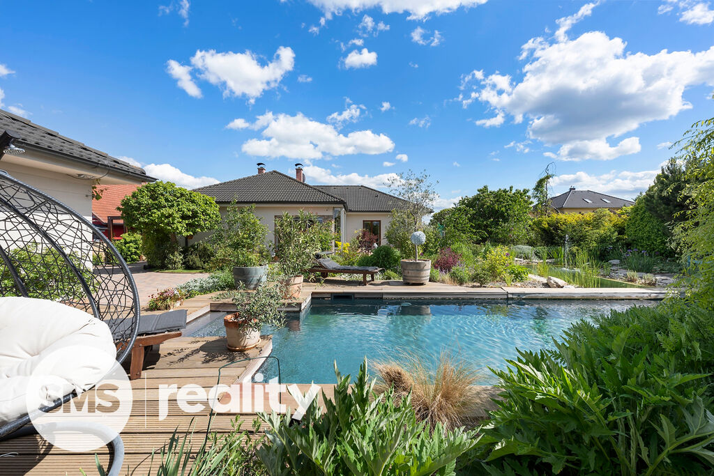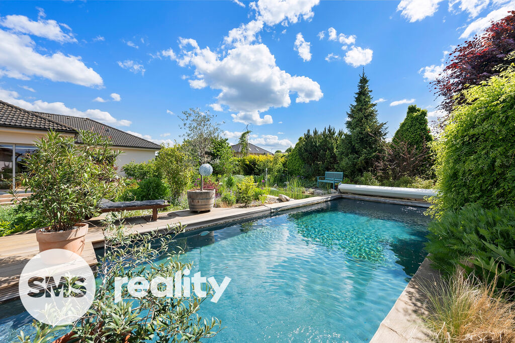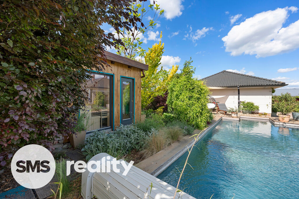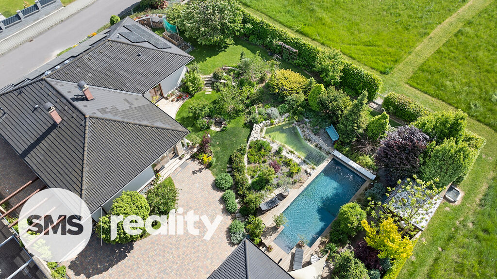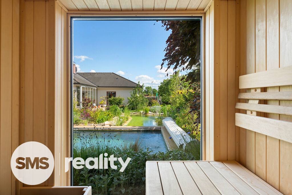 Zahrada byla pečlivě navržena zkušeným zahradním architektem a nabízí nejen naprosté soukromí, ale i vizuální harmonii v průběhu celého roku. Součástí je vyhřívaný bazén se slanou vodou, přírodní koupací jezírko a stylová sauna se zahradní sprchou pro dokonalý relax. Automatický závlahový systém je napojený na retenční nádrž a vlastní vrtanou studnu, což zajišťuje efektivní a ekologickou údržbu zahrady.