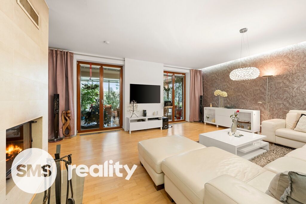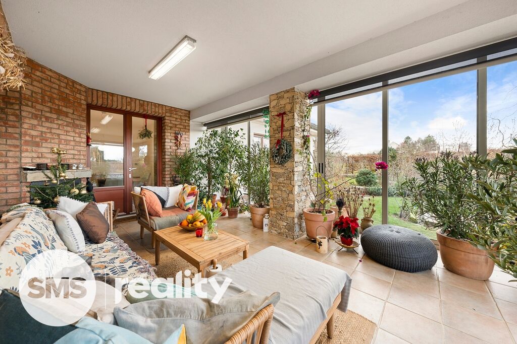 • Společenská část zahrnuje kuchyni s jídelnou, která navazuje na prostorný obývací pokoj s centrálním krbem a přímým vstupem na zimní zahradu s venkovním krbem.
