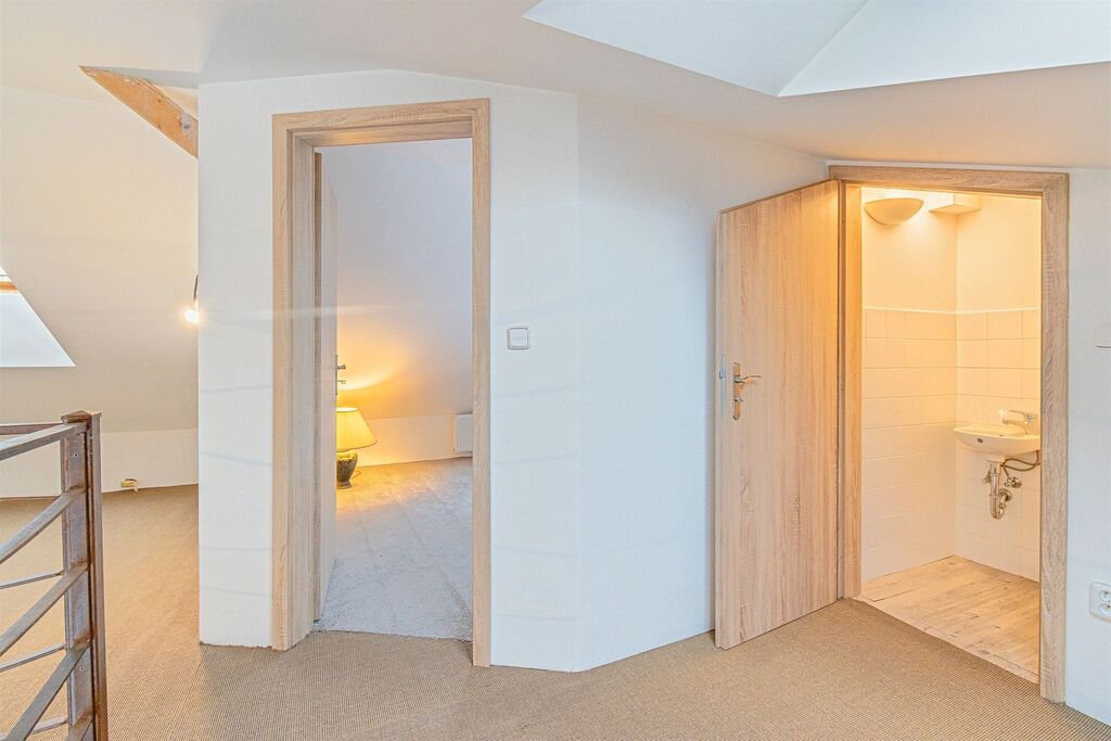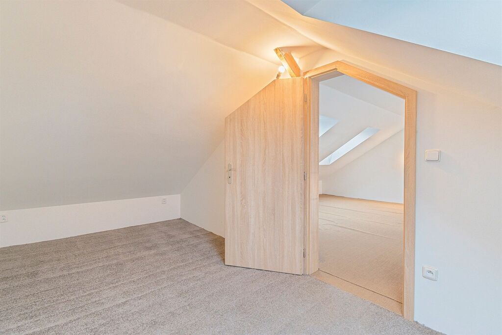 Dispozičně jsou zde tři samostatné pokoje, obývací pokoj s kuchyňským koutem a terasa. K bytu náleží místnost ve sklepě a možnost využívat zatravněný dvůr. Byt je vytápěný plynovým kotlem, který zajišťuje i ohřev teplé vody. V bytě je koupelna a dvě samostatné toalety.