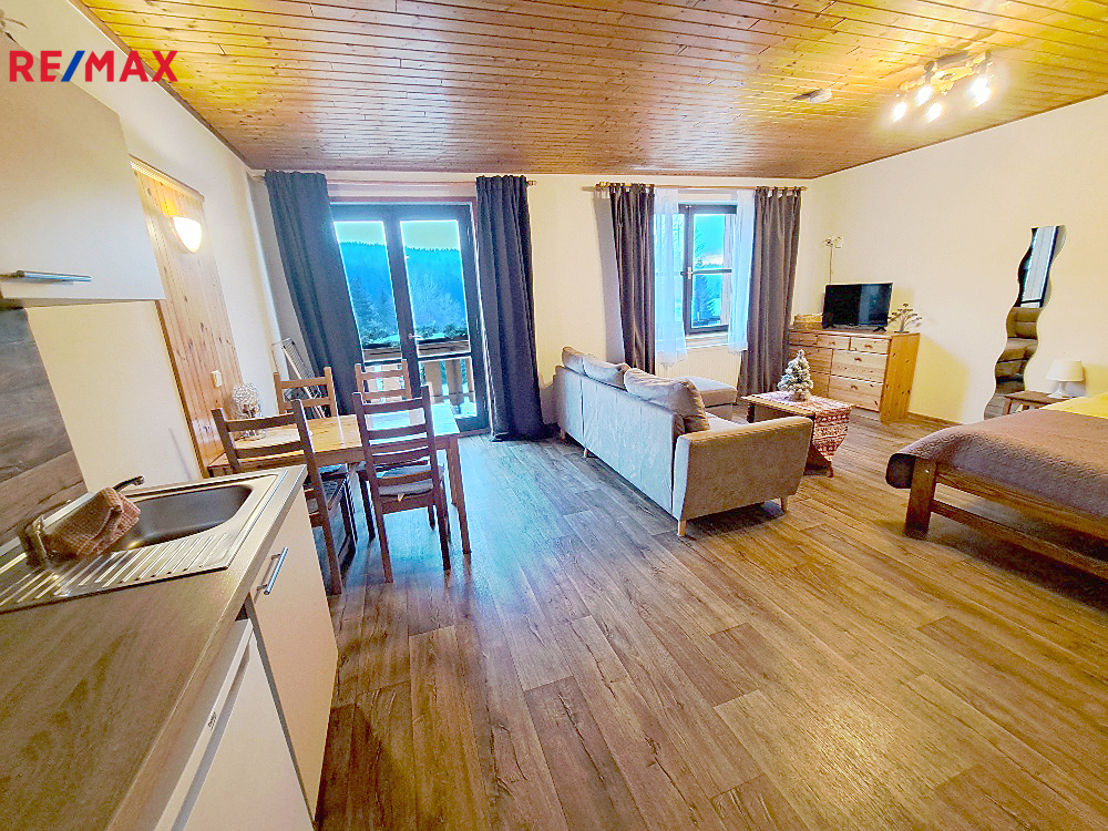 REZERVOVÁNO: Nabízíme Vám k dlouhodobému pronájmu plně vybavený prostorný apartmánový byt v samotném srdci Harrachova, byt se nachází na hlavní harrachovské třídě. Přímo z apartmánu je úchvatný výhled na Černou horu a její sjezdové tratě včetně můstků. Celková výměra bytu je 38 m2, z čehož 3,5 m2 tvoří balkón.
