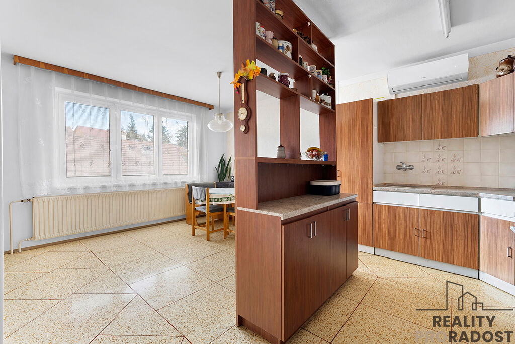 ze zádveří projdeme chodbou do světlé a prostorné kuchyně, která je rozdělena nábytkem na kuchyňskou část a jídelnu. Z kuchyně procházíme do obývacího pokoje. Je zde možnost tyto prostory jednoduše propojit. Z chodby se dostaneme do tří samostatných pokojů. Koupelna se sprchovým koutem a vanou je dostatečně velká pro rodinnou domácnost. WC je samostatné. Je zde také šatna a spížka se vstupem z chodby. Z chodby vede schodiště do suterénu domu.