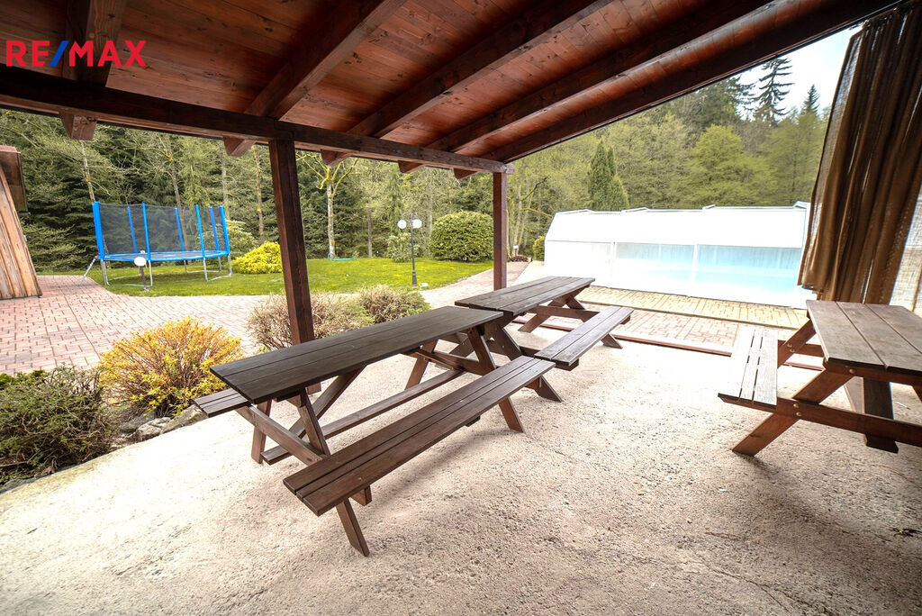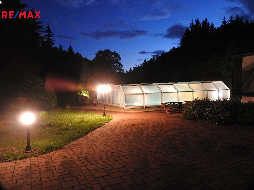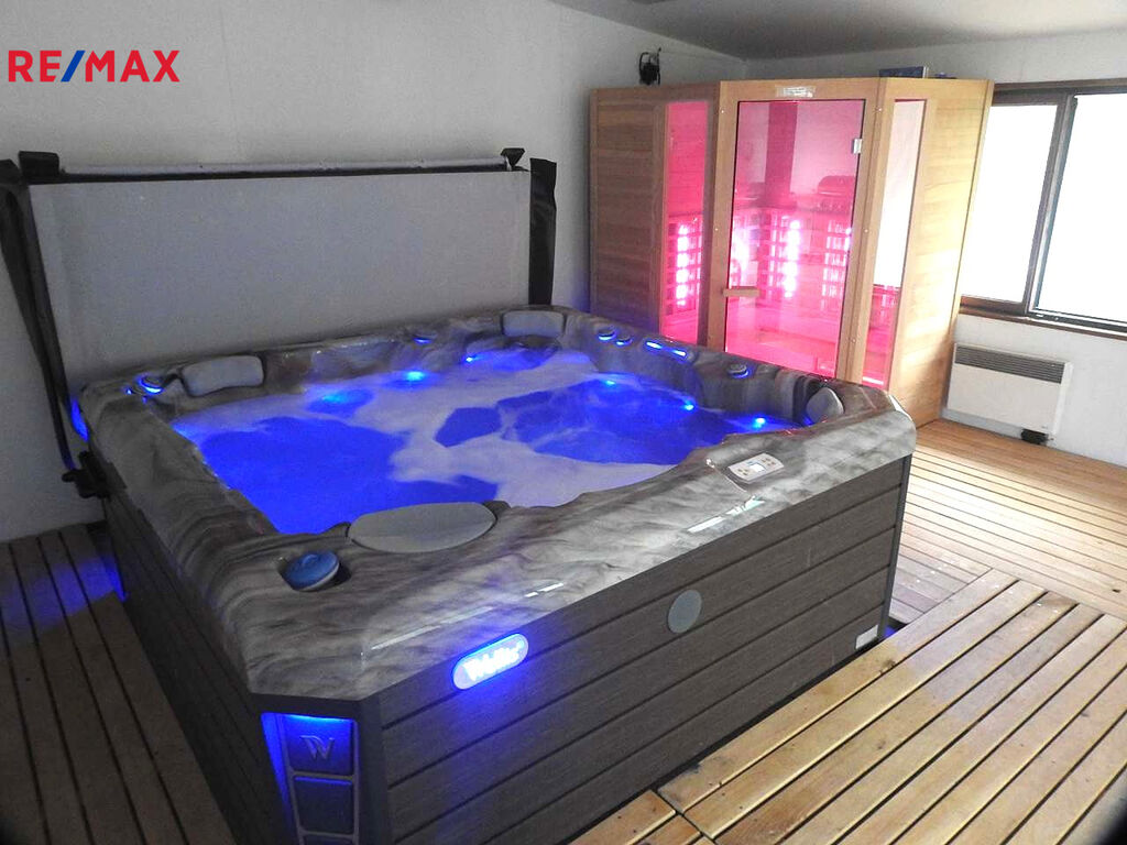 K nemovitosti dále patří krytý osvětlený venkovní bazén se slanou vodou 5x10m s protiproudem (zastřešení 8x14 m). Bazén je nově vyhříván tepelným čerpadlem. Profesionální whirlpoolka pro 5 osob s LED osvětlením – světelná terapie, ozvučená, s vodopádem vás uhrane, najdete v ní absolutní relax.