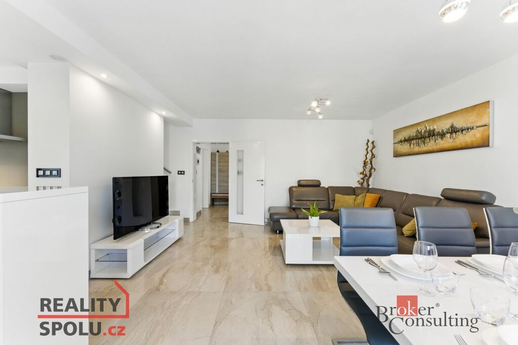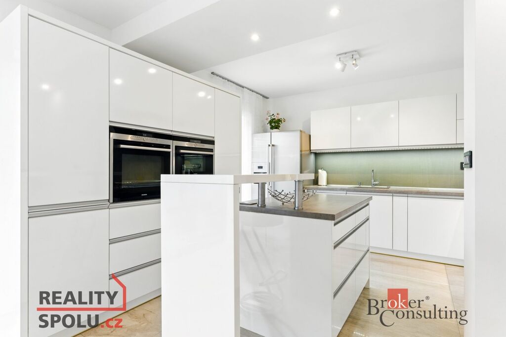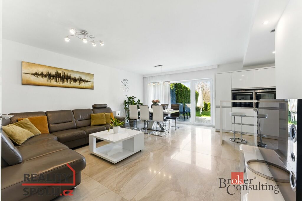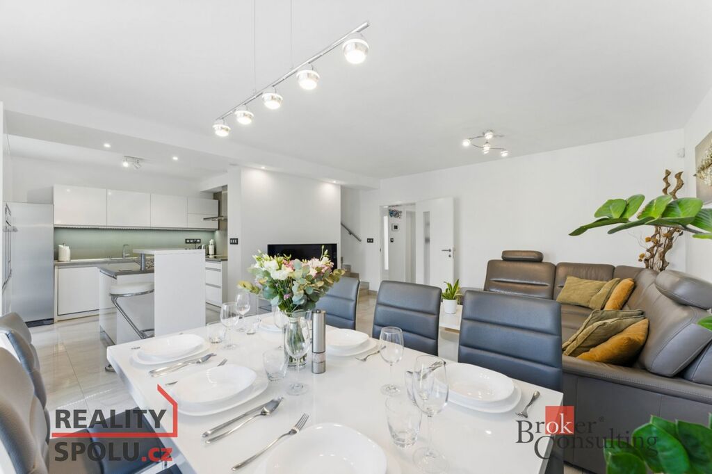 Dům nabízí 146 m² obytné plochy s promyšlenou dispozicí 5+kk. Dominantou je světlý obývací pokoj s kuchyní a jídelnou (38 m²), který plynule navazuje na terasu o velikosti 24 m² – ideální místo pro rodinné grilování i klidný odpočinek. Moderní kuchyně s ostrůvkem je vybavena nadstandardními spotřebiči značky Siemens, včetně parní trouby, indukční varné desky s velkou digestoří, americké lednice a ohřívacího šuplíku. Součástí kuchyňské části je také praktická spíž.