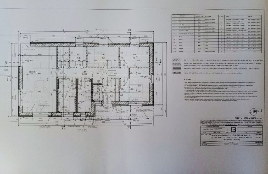 Dispozice: vstupní předsíň(5,18m2), samostatné WC(2,35m2), tech.místnost(6,58m2), koupelna s WC(8,91m2), obývací pokoj s kuch.koutem (33m2), spíž (3,23m2), chodba (11m2), 3 ložnice (13,15m2, 9,25m2, 8,8m2), šatna (4,72m2)+úložný prostor na půdě.