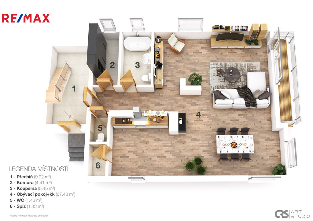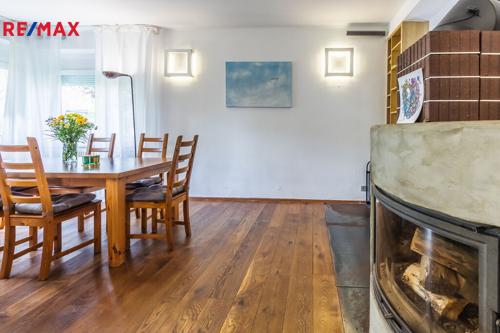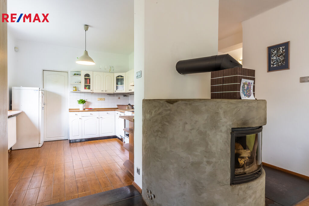 ✓ Prostorný obývací pokoj s atypickým krbem, kuchyňským koutem a spíží (celkem 70 m²)