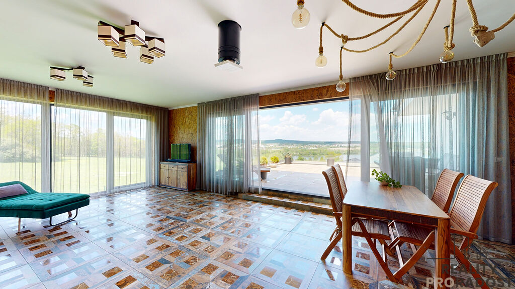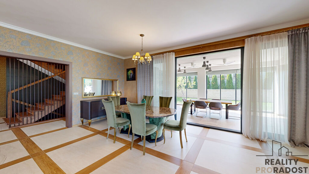 - Dvě terasy: 29,4 m² zasklená terasa (přízemí), 49,4 m² (patro)