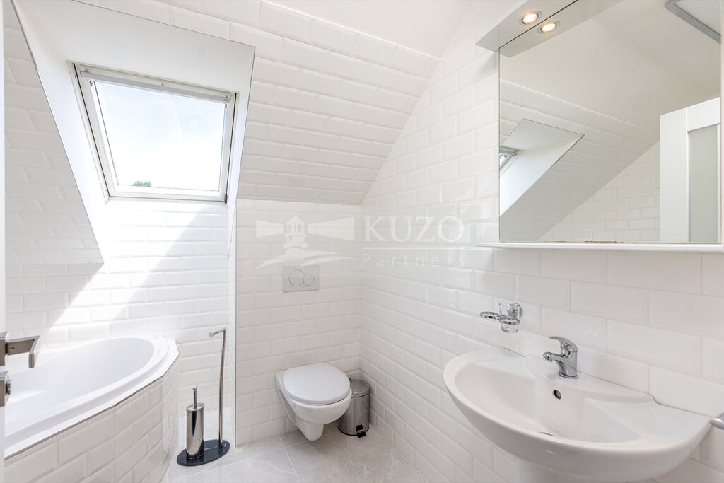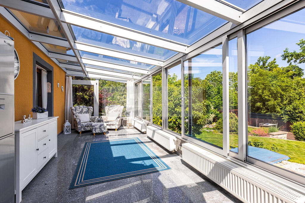 Na prostorný obývací pokoj s kuchyňským koutem plynule navazuje vytápěná zimní zahrada, která nabízí ideální prostor pro odpočinek během celého roku – ať už si užíváte ranní kávu, nebo večerní posezení s výhledem do zahrady.