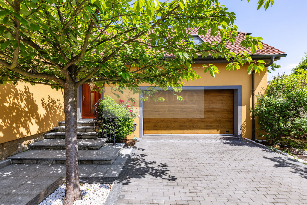 Již při příjezdu vás zaujme elegantní kovaný plot s masivními žulovými sloupky, který dodává celému domu reprezentativní charakter. Dálkově ovládaná vjezdová brána otevírá přístup k prostorné dvojgaráži, která zajišťuje komfortní parkování pro dvě auta a dostatek místa pro další vybavení.