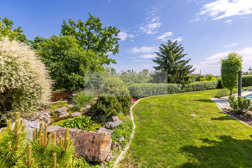 Za domem se rozkládá vzrostlá a pečlivě udržovaná zahrada, se zahradním altánem a druhou terasou, na kterou navazuje zahradní jezírko.. Najdete zde venkovní vyhřívaný bazén, ideální pro osvěžení během horkých letních dnů nebo pro večerní plavání pod hvězdami, zahradní altán s terasou, okrasné zahradní jezírko a různá zákoutí pro odpočinek.