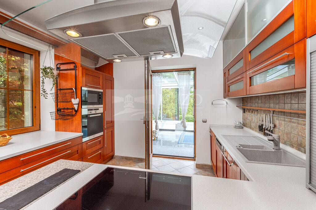 Interiér domu spojuje nadčasovou eleganci s maximální funkčností. Designová kuchyně osazená špičkovými spotřebiči Miele splní i ty nejnáročnější požadavky. Precizně zpracovaný nábytek na míru perfektně zapadá do konceptu prostoru a zajišťuje jeho praktické, a přitom estetické využití. Každý pokoj je navržen s ohledem na detail a poskytuje maximální pohodlí a eleganci.