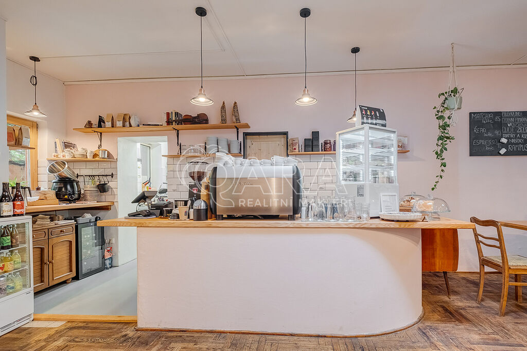 V přízemí se nachází dva nebytové prostory – nově rekonstruovaná kavárna s vlastní výrobnou (116 m2) a se zahrádkou, a dále prodejna knih s vchodem z náměstí (62 m2).