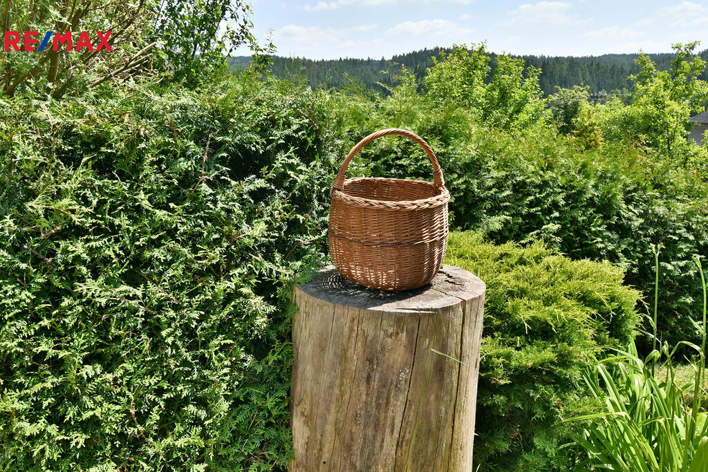 Na zahradě se nachází okrasné dřeviny a ovocné stromy. Za domem je k dispozici přístřešek na dřevo či zahradní náčiní. Navazující pozemek o rozloze 3 849 m² je využíván jako louka, ale lze jej využít dle potřeby – k pěstování, chovu zvířat, rekreaci či pronájmu.