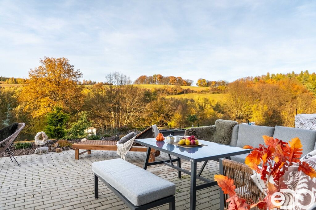 Dům je nízkoenergetický, vytápěný tepelným čerpadlem, s podlahovým topením, rekuperací a elektrickými roletami. Dispozice nabídne prostorný obývací pokoj s výstupem na terasu s krásným výhledem, kuchyňský kout, ložnici, tři další pokoje, koupelnu i technické zázemí. Zahrada je menší než u první varianty, ale stále poskytne dostatek prostoru na posezení, bazén, pěstování i rodinné aktivity – bez nutnosti řešit velký pozemek navíc.