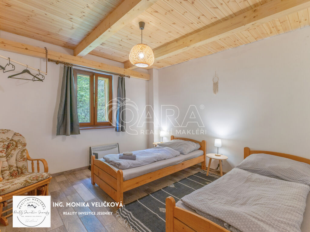Chalupa stojí na klidném místě u lesa s vlastním pozemkem, přístupovou cestou a parkováním. Výborná dostupnost – Jeseník 10 min, Mikulovice 5 min, Ostrava 2 h, Olomouc 1,5 h.