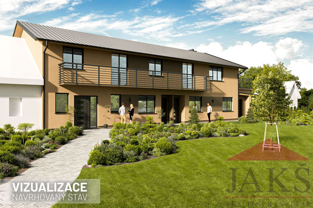 Apartmán/byt č. 7 o dispozici 1+kk s balkonem, skladem a parkovacím místem na oploceném pozemku s komunitní zahradou se skleníkem, trampolínou a posezením.