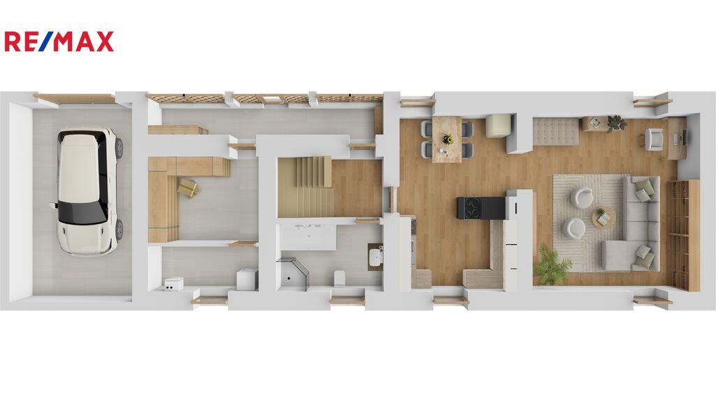 Přízemí tvoří vstupní zádveří, chodba, útulná kuchyň s kachlovými kamny propojená s jídelnou, velkorysý obývací pokoj ideální pro rodinná setkání, koupelna s vanou, sprchovým koutem a toaletou, dvě praktické technické místnosti a garáž.