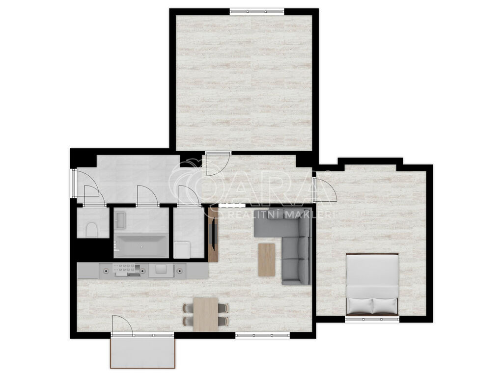 Dispozice bytu je velmi prakticky řešena. Byt má neprůchozí a dostatečně prostorné pokoje, samostatný obývací pokoj včetně kuchyňského koutu a vstupem na balkon. V bytě je také prostor na vestavěné skříně, které se dají instalovat do stavebních otvorů ve stěnách v předsíni i v pokoji. Toaleta je samostatná a oddělená od koupelny.