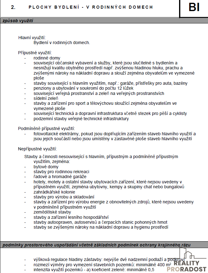 Na pozemku se nyní nachází povolená, ale zatím v katastru nemovitostí nezapsaná stavba o výměře 50m². Jde o podsklepenou dvojgaráž s menší dílnou. Novému majiteli se tak nabízí možnost stavbu bez legislativních potíží zbourat a nebo mu ji před prodejem necháme do katastru nemovitostí zanést. Dle územního plánu by krom vlastního rezidenčního bydlení šlo parcelu využít i investičně a vybudovat zde třeba rodinné domy o více jednotkách. Uliční šíře je cca 15m a v případě zájmu lze odprodat i vedlejší, navazující stavební pozemek s rodinným domem o uliční šíři cca 18,5m. Spodní část pozemku ohraničuje Habrovanský potok. Ve vrchní části vedou přes okraj pozemku u přístupové cesty inženýrské sítě zajištěné věcným břemenem. Přibližně v půlce pozemku se nachází přečerpávací jimka odpadních vod pro dvě sousední stavby.