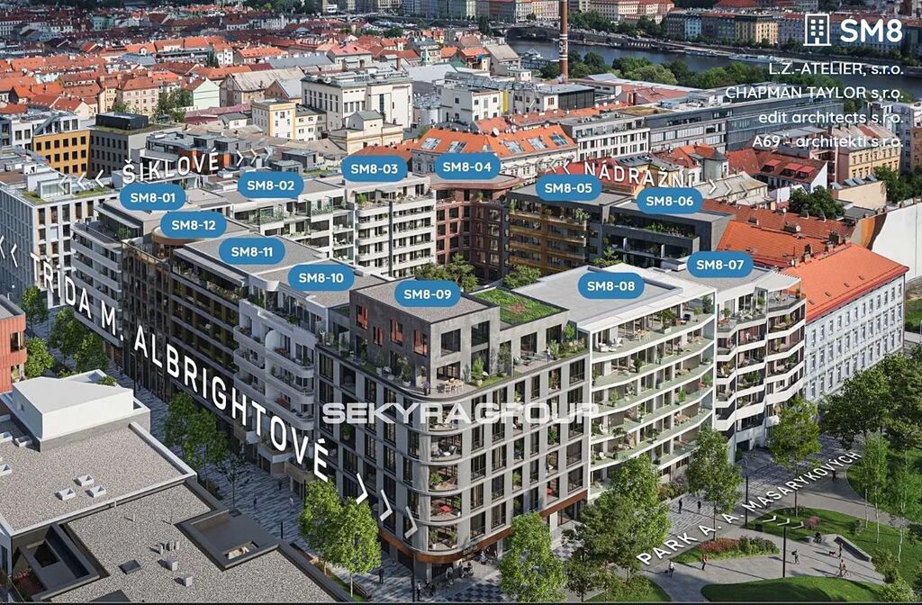 SM8 navazuje na již realizované rezidenční bloky SM1/2 a SM3 a zahrnuje celkem 12 bytových domů. Je součástí projektu Smíchov City, jehož záměrem je nabídnout obyvatelům moderní bydlení s vysokým standardem provedení, vybavené špičkovými technologiemi. Nespornou výhodou je navíc umístění v centru města. Exkluzivní byty doplní v přízemí objektů funkční městský parter s obchody a službami. V ulicích budou vysázeny stromy, které zpříjemní klima a v horkých dnech poskytnou chladivý stín. Blok sousedí s třídou Madeleine Albrightové pojatou jako pěší podélný park a budoucím parkem Alice a Anny Masarykových.