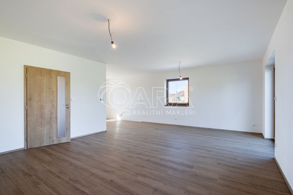 Dům o dvou podlažích (1. NP 54 m², 2. NP 50 m²) je dispozičně řešen jako 4+kk, přičemž v přízemí se nachází společenská zóna: obývací pokoj s kuchyňským koutem, předsíň, samostatné WC a technická místnost. V patře jsou tři samostatné ložnice a velkorysá koupelna se sprchovým koutem (v koupelně je také skrytá příprava pro vanu) a s WC. Téměř v celém domě je položena rigidní vinylová podlaha, v předsíni, technické místnosti a v koupelně je dlažba. V půdním prostoru je vytvořena pochozí půda o velikosti cca 25 m² k ukládání sezónních věcí.