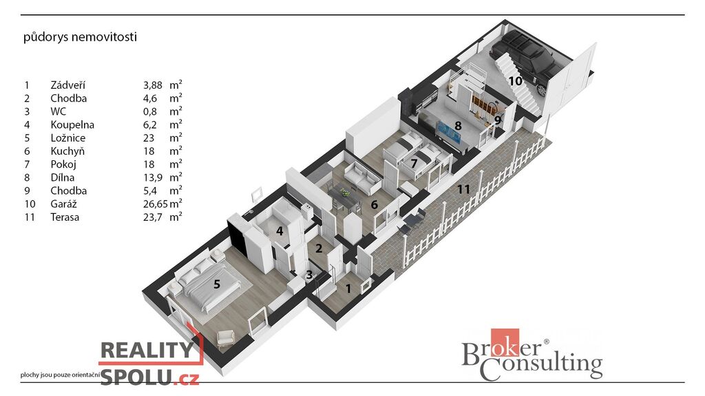 ° dispozice 3+kk - 75 m² obytná část + zádveří, dílna a stodola - 69 m²