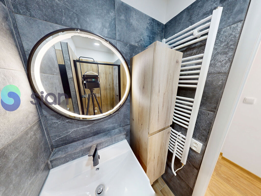 V koupelně najdete sprchový kout, moderní umyvadlovou skříňku a zrcadlo. Celý byt působí čistě, vkusně a svěže. Velkým benefitem jsou venkovní elektrické rolety, které zajišťují pohodlí i soukromí.