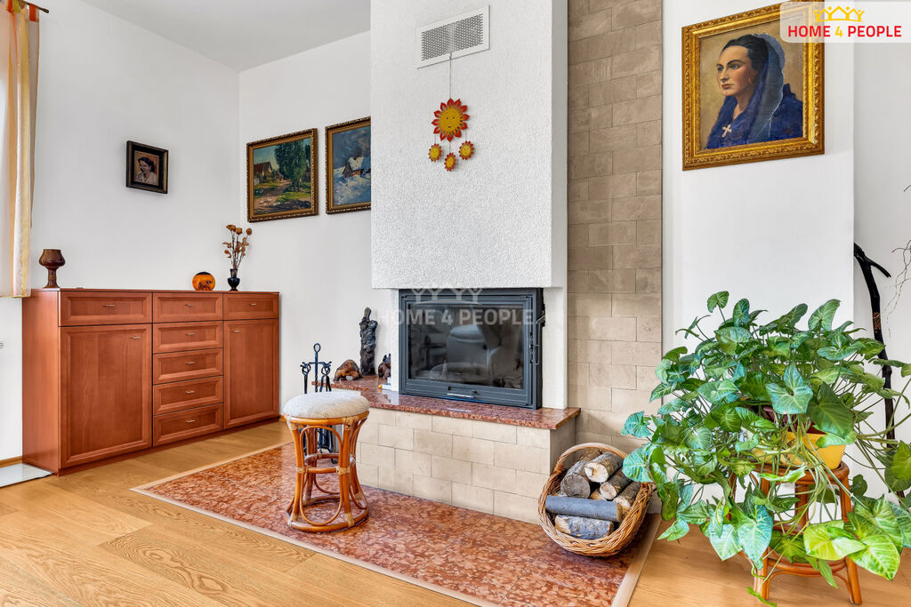 V přízemí domu se nachází prostorný obývací pokoj s krbem a vstupem na terasu, kuchyň s jídelnou, pokoj a koupelna s wc a sprchovým koutem.