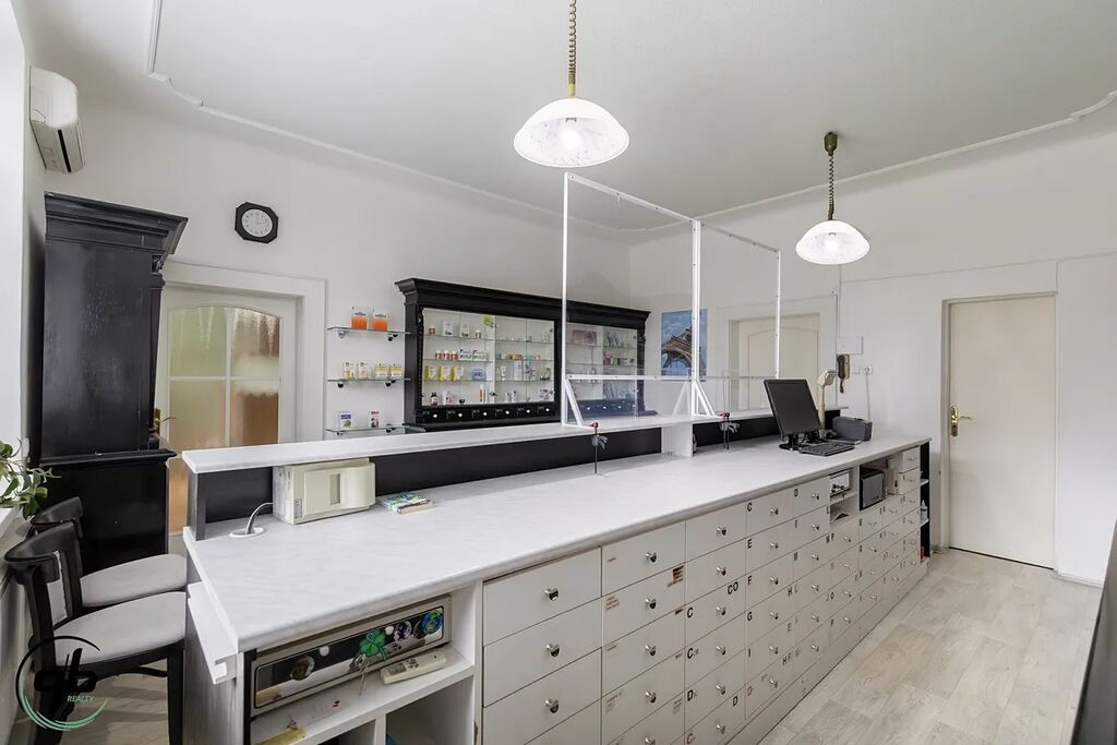 Přízemí (celé předmětem prodeje, vyjma společné chodby): vstupní chodba se dvěma vchody (hlavní a samostatný), čtyři průchozí a samostatné místností, prostor lékárny, umývárna, toaleta, úklidová místnost. Součástí je také bytová jednotka aktuálně využívána jako lékařská ordinace (kuchyně, pokoj, ložnice, koupelna). Celkové uspořádání odpovídá dispozici 7+1 s příslušenstvím.