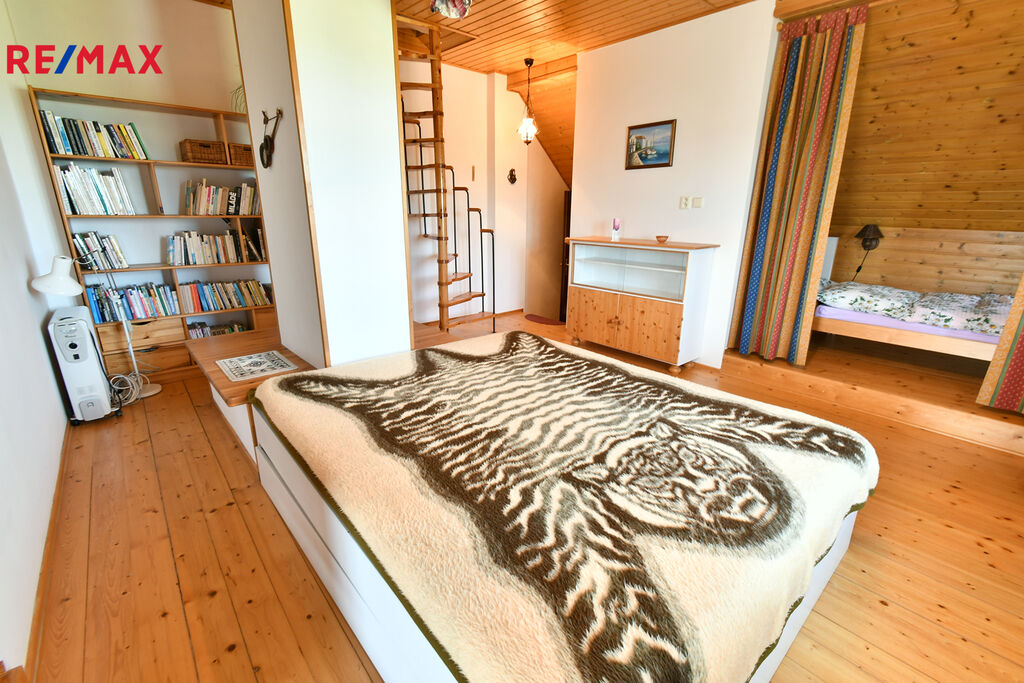 V přízemí se nachází předsíň, jídelna s kuchyňským koutem, obývací pokoj, technická místnost, chodba s úložným prostorem v mezipatře a koupelna s WC. Do 1. patra vede dřevěné schodiště, kde najdete prostornou ložnici s dvěma oddělenými prostorami a vstup na menší terasu. Další schodiště vede do sníženého podkroví, které slouží jako druhá ložnice. Půdorysy s rozměry a fotografie jsou součástí fotodokumentace.