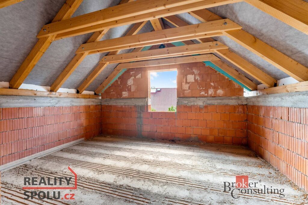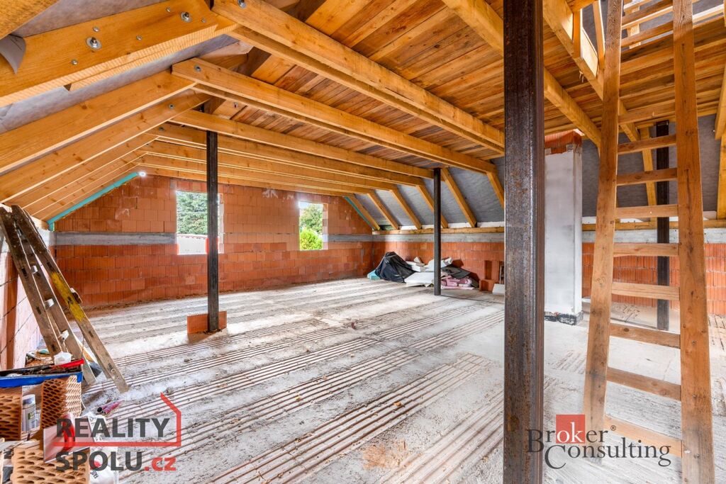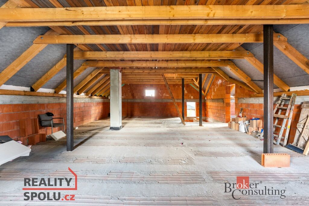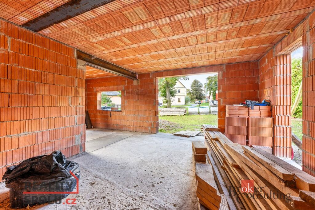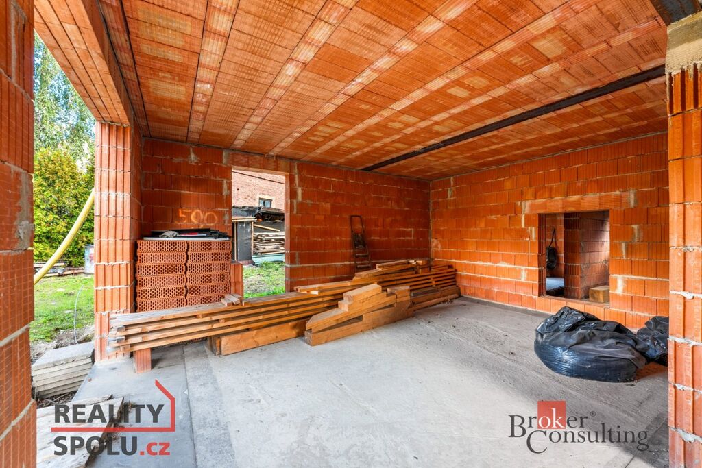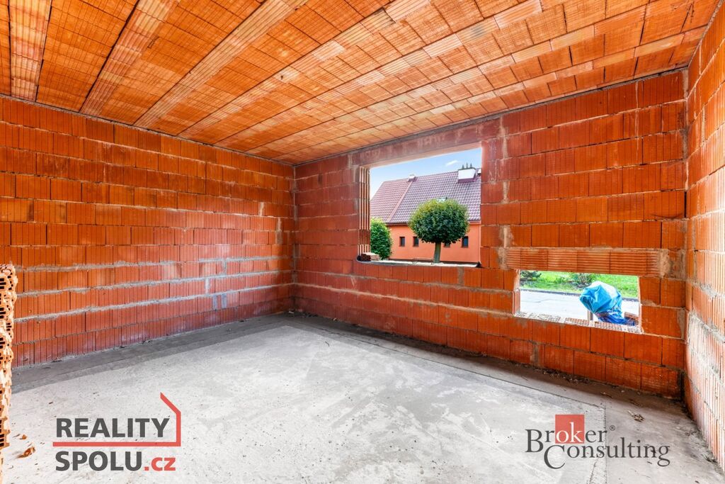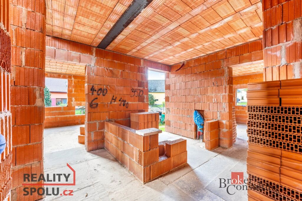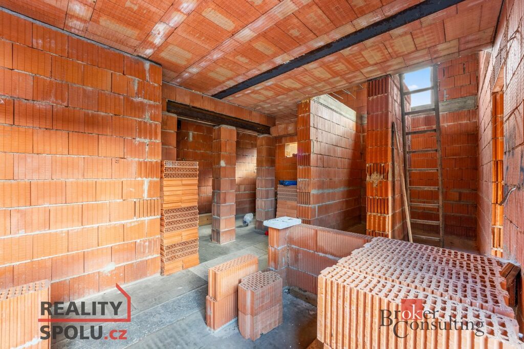 Dvoupodlažní cihlový dům o celkové ploše přibližně 204 m² stojí na pozemku o velikosti 546 m² a je ve fázi hrubé stavby – má vyzděné obvodové i vnitřní zdi a dokončenou střechu. Na pozemku jsou kompletní inženýrské sítě – vodovod, kanalizace, elektřina i plyn – a k dispozici je kompletní projektová dokumentace, která umožňuje dokončit dům podle původního návrhu nebo upravit detaily dle vlastních představ.