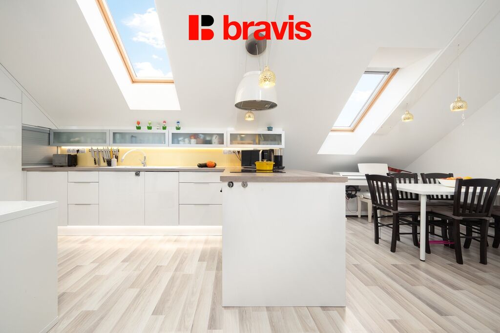 Ihned při vstupu vás přivítá chodba se schodištěm, jež vás zavede do centrální části bytu – velkorysého obývacího pokoje s moderní kuchyní o výměře 43 m². Dále je z chodby přístup do dalšího pokoje (16 m²) a prostorné koupelny (8 m²). Kuchyně je plně vybavena kvalitními spotřebiči, nabízí bohaté úložné prostory a dostatek pracovní plochy pro vaření. Jídelní kout plynule přechází do prostorného obývacího pokoje, který je ideálním místem pro společné chvíle s rodinou či přáteli.