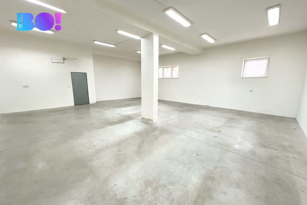 V přízemí se nachází prostor o výměře 96 m², který lze využít jako dílnu, sklad, nebo menší výrobnu. Místnost je vybavena podlahovým vytápěním a v případě zájmu lze využít i kovové regály, které jsou již zahrnuty v ceně pronájmu.