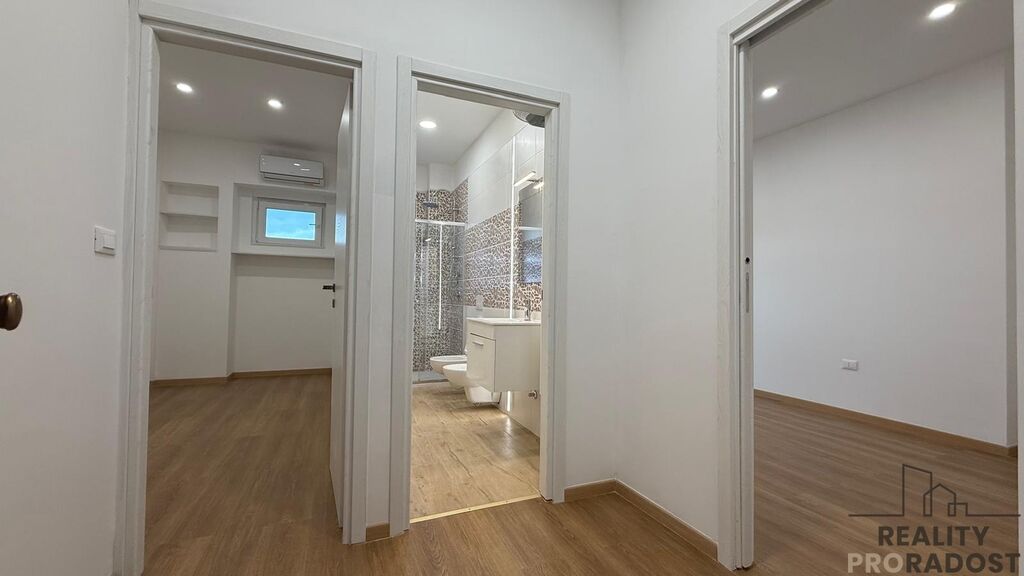 Tento byt prošel kompletní rekonstrukcí, která mu dodala svěžest, moderní charakter a elegantní atmosféru. Z lodžie je částečný výhled na moře, také na zelený parčík přímo před domem, za kterým se nachází písečná pláž.