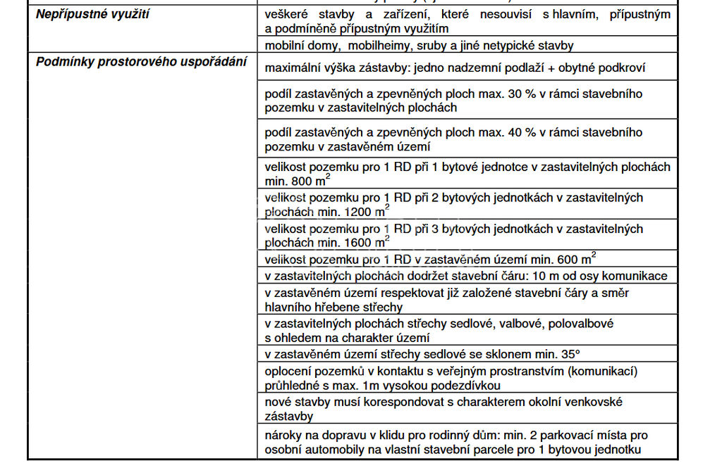 - maximální výška zástavby: 1 nadzemní podlaží + obytné podkroví
