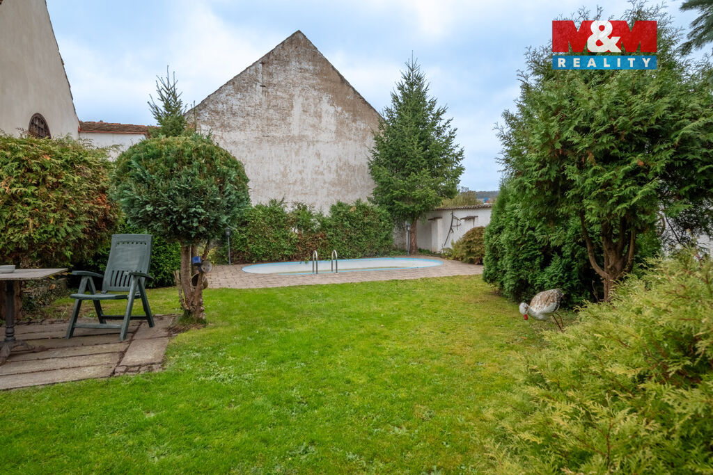 Na uzavřeném dvoře se nachází parkování pro 2 vozy, zděná kolna a okrasná zahrada se zapuštěným bazénem (207 m²).