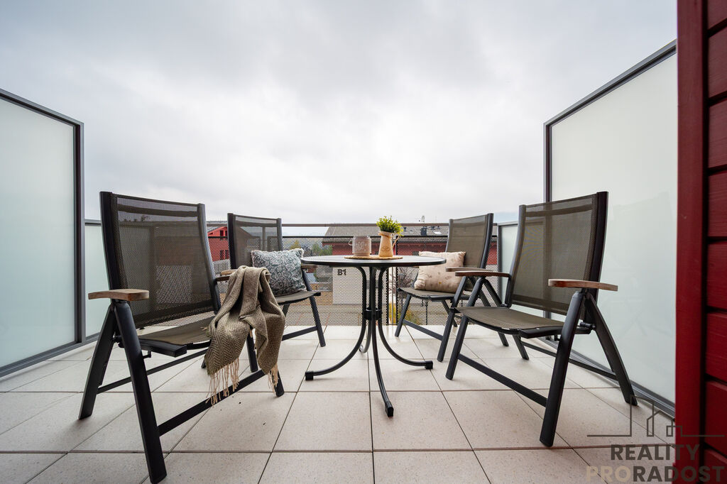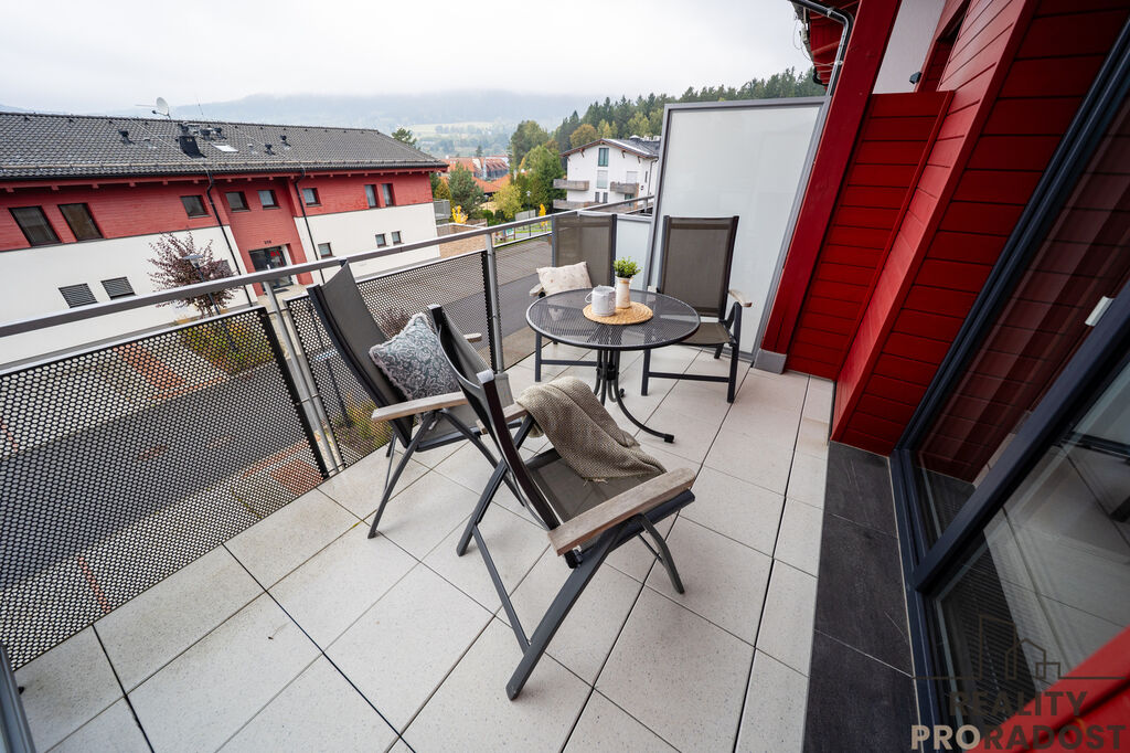 Velkou předností tohoto bytu je balkon o rozloze 8 m², na který se dostanete přímo z obývacího pokoje. Perfektní místo pro ranní kávu nebo odpolední relaxaci s výhledem na okolní krajinu. Dále k bytu náleží sklepní kóje o výměře 4 m², ideální pro uskladnění lyží nebo dalšího vybavení.