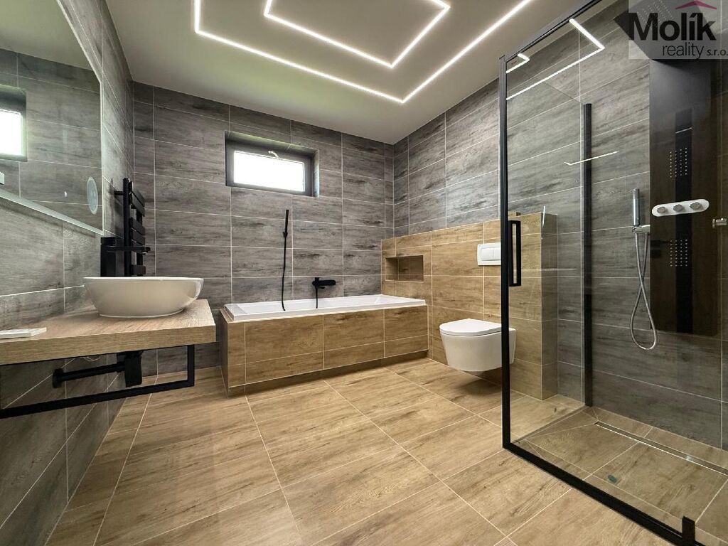 Dispozičně je dům řešen jako 4kk + šatna, prostorný obývací pokoj, ze kterého je vstup na zahradu je propojen s kuchyní + 3 pokoje a šatna, obložky + pokojové dveře, snížené stropy, v koupelně je jak sprchový kout, tak i vana, umyvadlo, zrcadlo s podsvícením, otopný žebřík, toaleta sanita RAVAK, k dispozici je ještě oddělená toaleta při vstupu do domu, technická místnost s akumulační nádrží na vodu + přípojka na pračku a sušičku, v celém domě je položena vinylová podlaha.