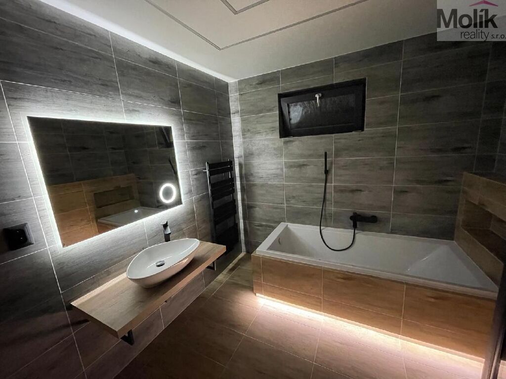 V chodbě a kolem vany je noční podsvícení.