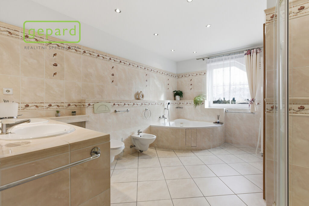 V patře jsou tři samostatné místnosti a velmi prostorná koupelna s vanou, sprchovým koutem, WC i bidetem. Z koupelny vede další místnost, která slouží, jako technické zázemí (pračka, sušička ap.). Dále se v patře nachází další úložná komora s výlezem na půdu.