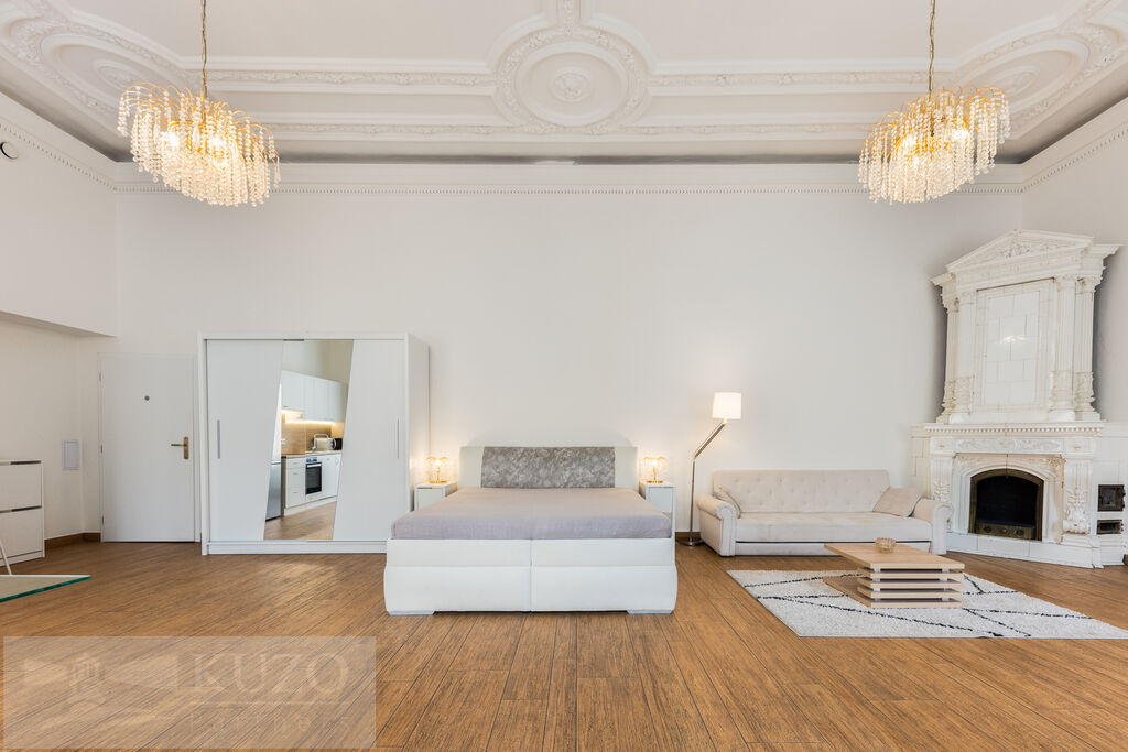 kompletní vybavení: kuchyňská linka s vestavěnými spotřebiči, kvalitní nábytek, křišťálové lustry – byt je připraven k okamžitému užívání