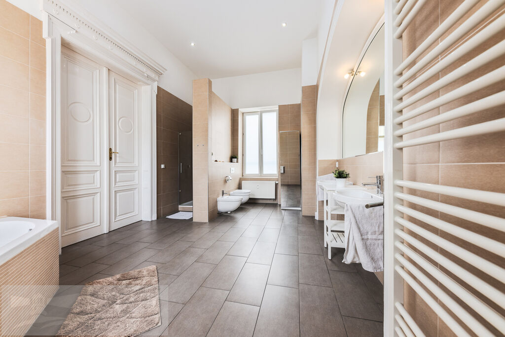 designová prosvětlená koupelna se dvěma okny (18,2 m²) s rohovou vanou, sprchovým koutem, dvěma umyvadly, WC a bidetem,