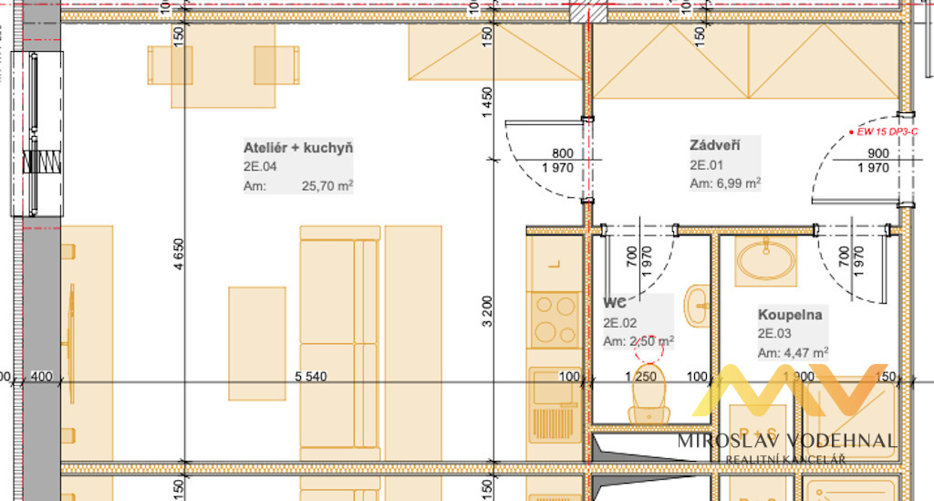 Dispozice: obývací pokoj s kuchyňským koutem, koupelna s WC a předsíň.