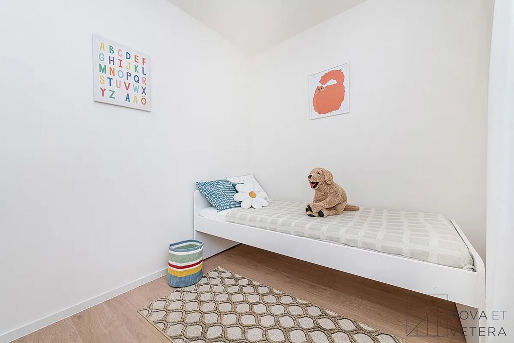 Dispozičně byt nabízí obývací pokoj s kuchyňským koutem, dva samostatné pokoje vhodné jako ložnice a dětský pokoj nebo pracovna, prostornou vstupní chodbu a moderní koupelnu s toaletou. K bytu náleží sklepní kóje o velikosti 2 m².