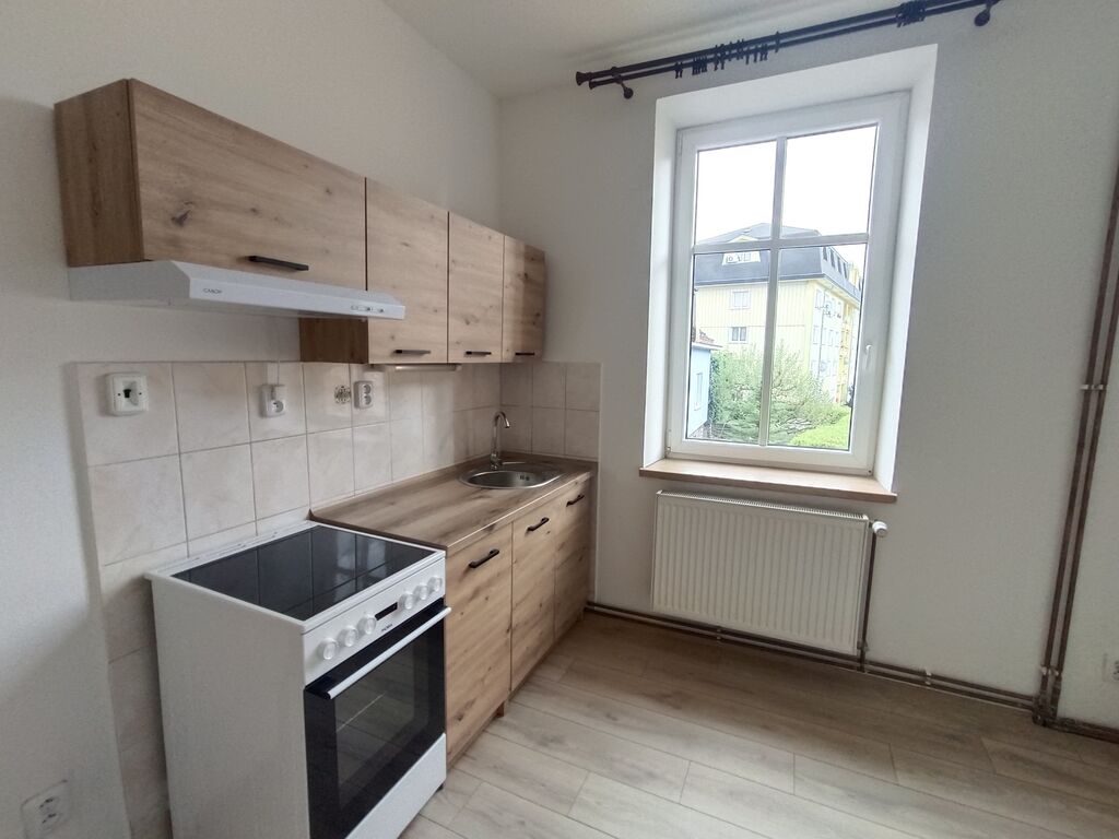 pokoj s kuchyňskou linkou, sklokeramický sporák a plovoucí podlaha, výhled na ulici