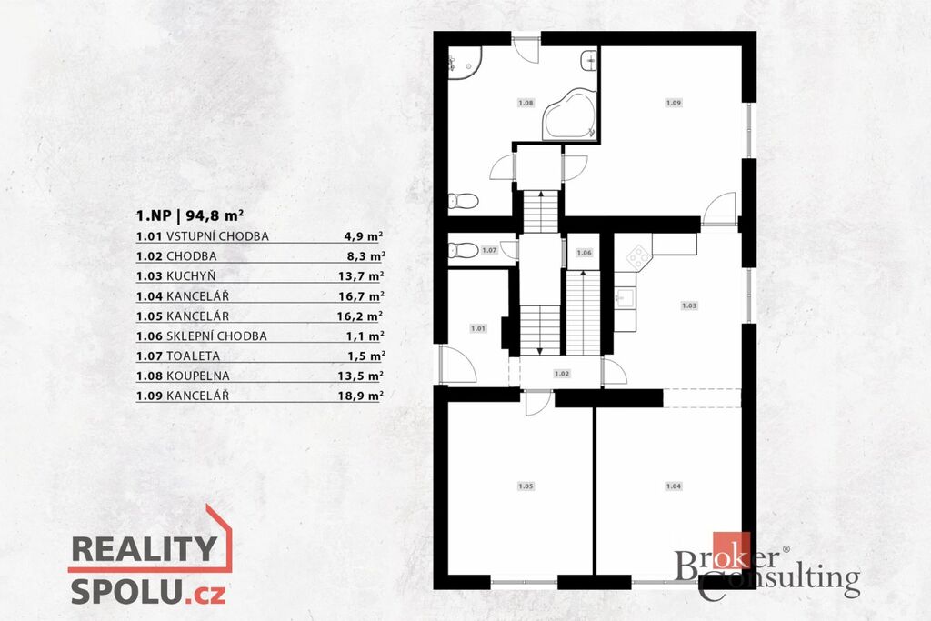 1. NP: tři kanceláře, kuchyň, koupelna, toaleta – ideální pro firemní zázemí nebo samostatnou bytovou jednotku,