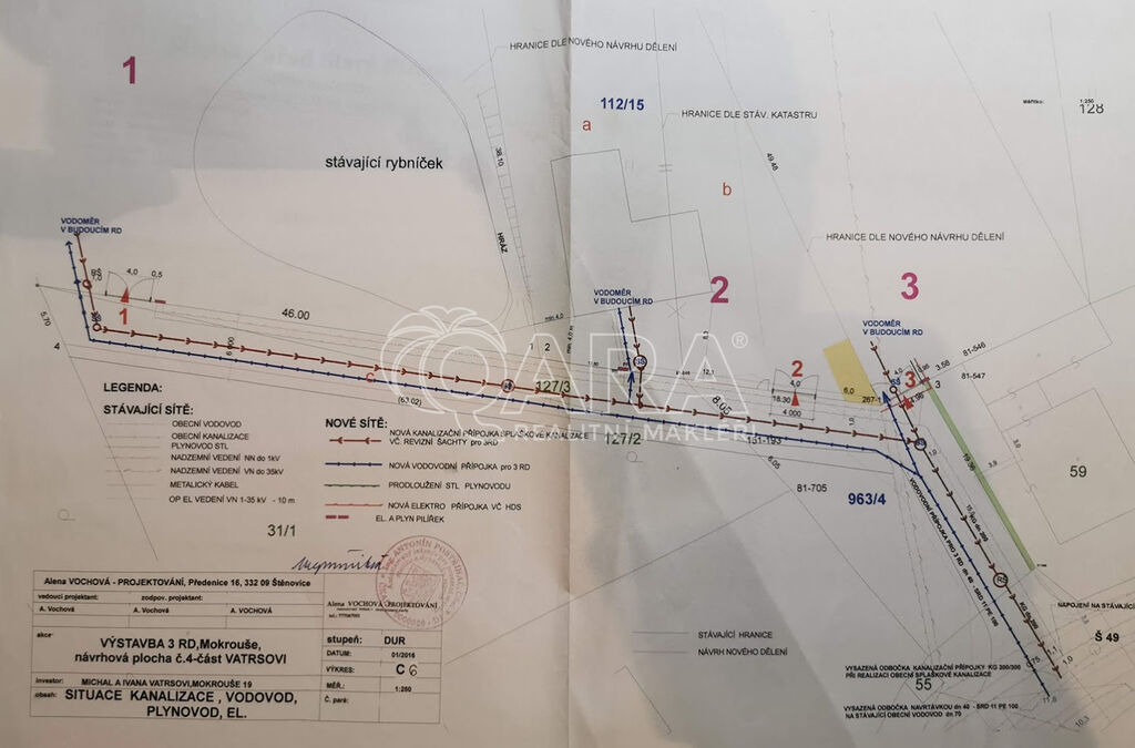 Pozemek je v územním plánu veden jako „Plocha smíšená obytná venkovská - plocha stabilizovaná“, což zaručuje jeho primární určení pro bydlení. Inženýrské sítě: veškeré dostupné inženýrské sítě jsou již vedeny v komunikaci na hranici pozemku, což výrazně usnadní připojení. Navíc je zde podána žádost o zřízení elektrické přípojky. Na pozemku je také připravena hromada kvalitní zeminy, pro srovnání terénu a finální úpravy parcely.