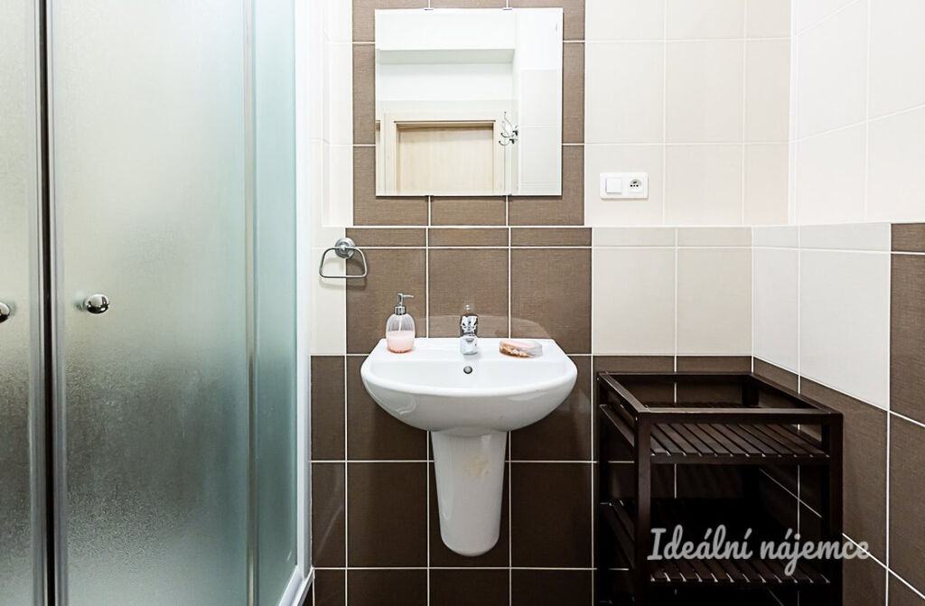 Byt je nabízen plně vybavený, což ulehčí starosti s jeho zařizováním. Kuchyně disponuje lednicí s mrazákem, elektrickou a mikrovlnnou troubou, digestoří, jídelním koutem a také dostatkem úložného prostoru. Obytná část je zařízena pohodlným gaučem, televizí, úložným prostorem a také je k dispozici přímý vstup na balkon. Koupelna je vybavena sprchovým koutem, umyvadlem, pračkou a WC.