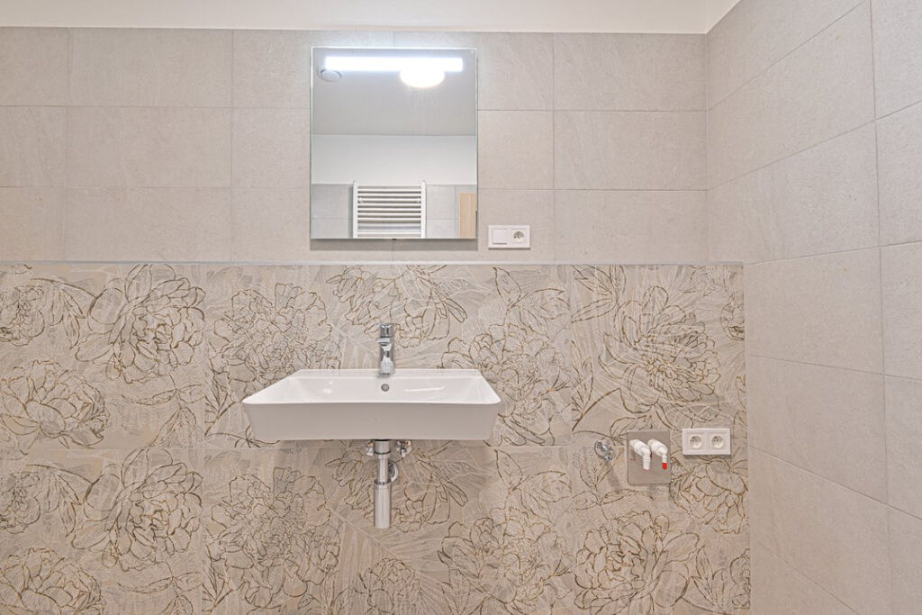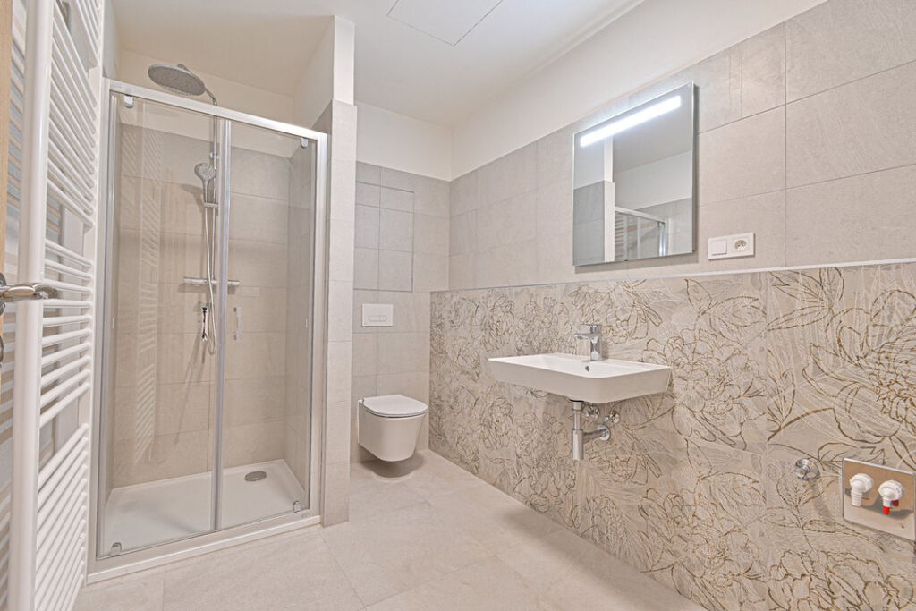 Byt se nabízí vybavený dle fotografií. Kuchyně disponuje lednicí, myčkou, elektrickou troubou, varnou deskou, mikrovlnnou troubou a digestoří. V koupelně je sprcha, umyvadlo a toaleta.